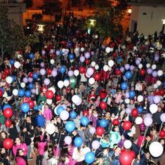 Azules, blancos y rojos simulando a la bandera francesa y morados en homenaje a las mujeres maltratadas, la plaza se llenó minutos antes de las ocho de la tarde de un montón de niños que agarraron fuertemente sus globos y los soltaron a la voz de ¡Viva San Ponciano! y ¡Viva Pradejón! en una nube que quiso transmitir «fuerzas a esas familias que por un motivo u otro lo están pasando tan mal estos días», dijo el alcalde de la localidad, Óscar León.