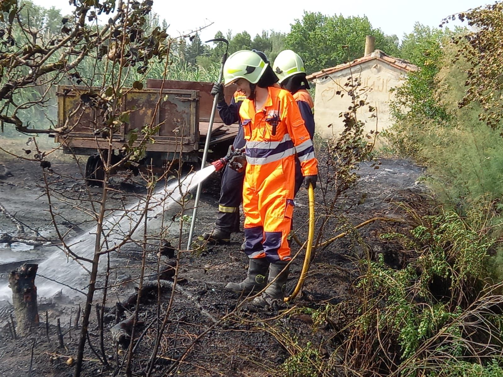La rápida intervención de los voluntarios y su camión motobomba ha evitado que el incendio se extendiera por la finca. Eso sí, ha calcinado varios cajones de madera para la recogida de la fruta y ha afectado al remolque de un tractor.