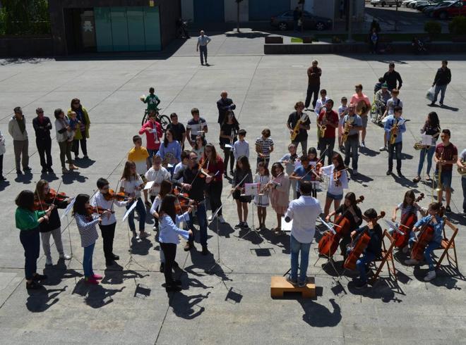 «No lo habíamos hecho nunca», decía entusiasmado el director de la banda juvenil de la escuela, Alejandro Incera. «Habíamos visto hacerlo a otros grupos con el 'Himno de alegría' o la canción de 'Piratas del Caribe' y nos pareció interesante llevarlo a cabo aquí», explicó. Después del éxito en la plaza de España, los jóvenes músicos lo repitieron en la Puerta Munillo.