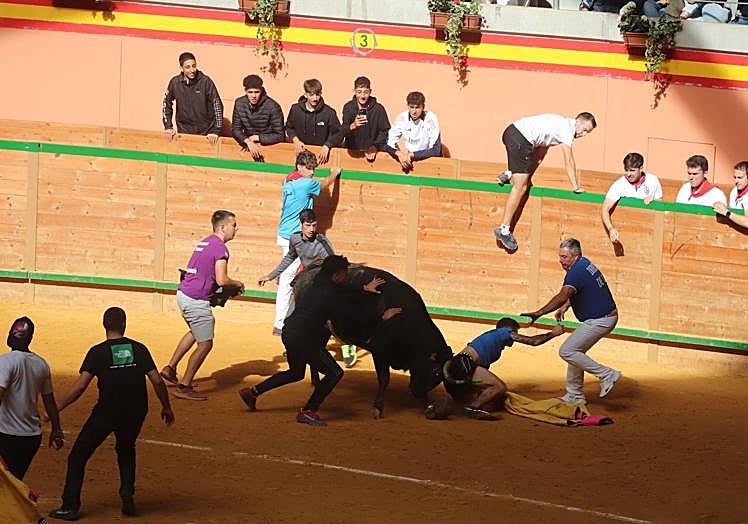 Entre los valientes, hubo buenos engaños a las redes, cercanos y aplaudidos y también algún susto, como el de un joven que estuvo varios segundos zarandeado en los cuernos de una res. Sorprendentemente, se levantó como si nada, recogió la chaqueta y la zapatilla perdidas, se subió y ajustó los pantalones y se quedó en el coso. Como un recortador más, pero sin entrar a la carrera. Y, eso sí, rebozado de arena.