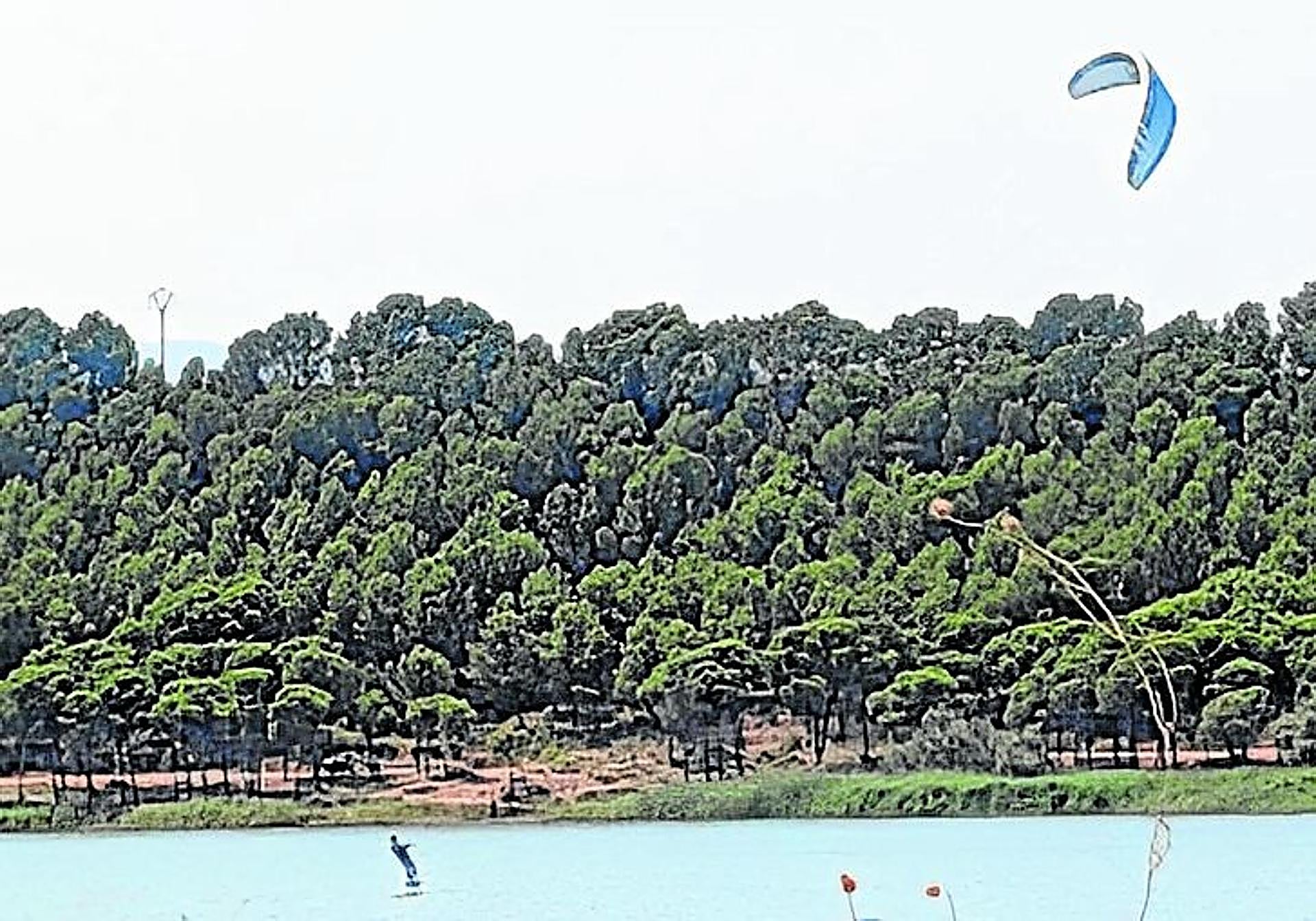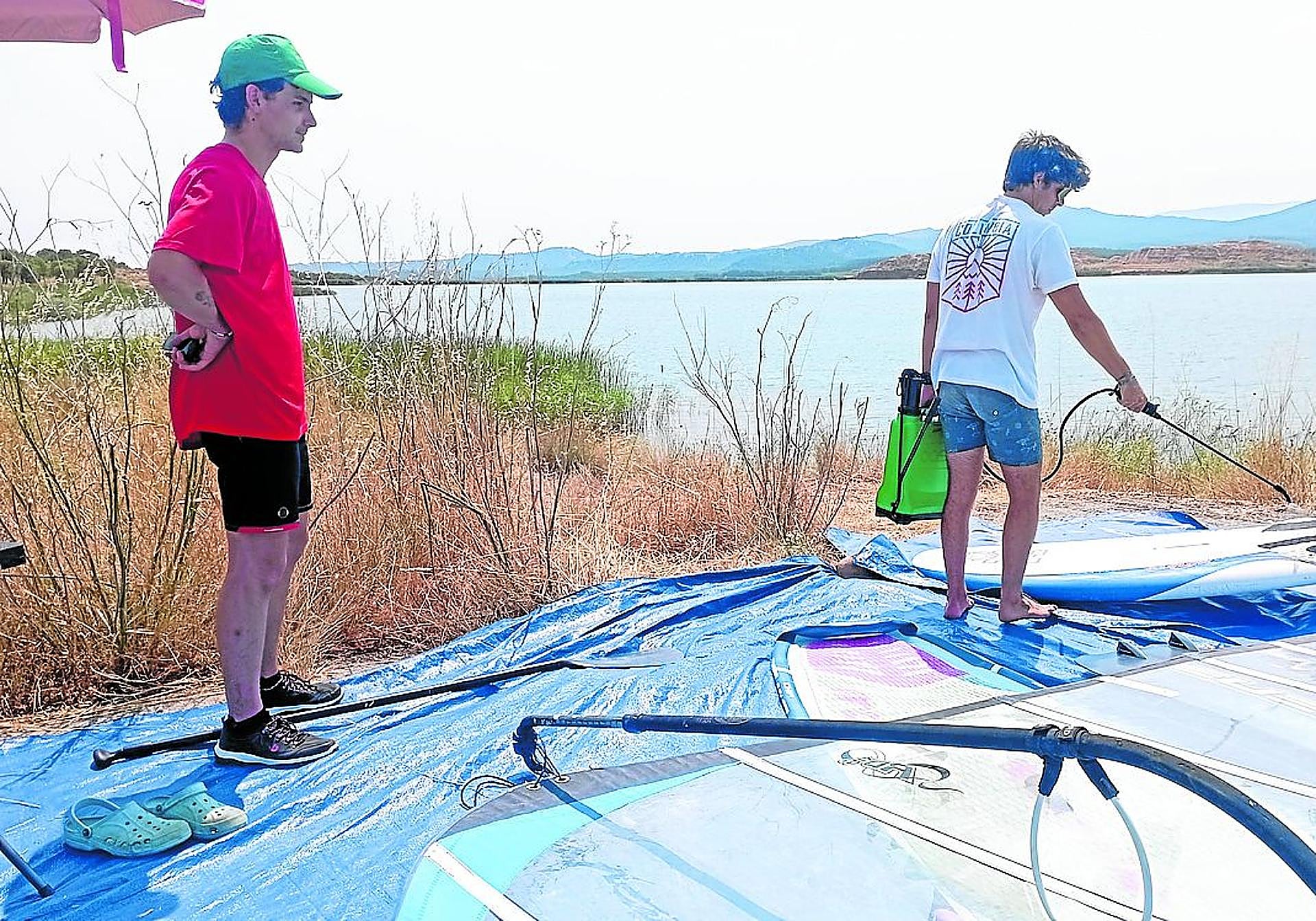 No eran pocas las ganas que el windsurfista calagurritano Javier Argaiz tenía de volver a surcar con su tabla las aguas del Perdiguero, restringidas a la navegación desde la pandemia. «Fui el último que se bañó legalmente y seré el primero que lo haga también», decía entre risas quien confía en las posibilidades de este pantano, propiedad de la Comunidad General de Regadíos de Calahorra, para disfrutar del agua como muchos windsurfistas hacen en Zaragoza, en la Loteta. Las condiciones son muy buenas por el bochorno, el viento sureste. «No hay pantanos de sitios cercanos donde entre tan bien como aquí», valora Argaiz, a la vez que explica que este aire caliente, «aprovechando la vaguada de debajo de la presa, se encañona y entra muy bien».