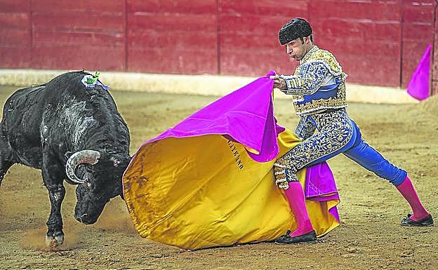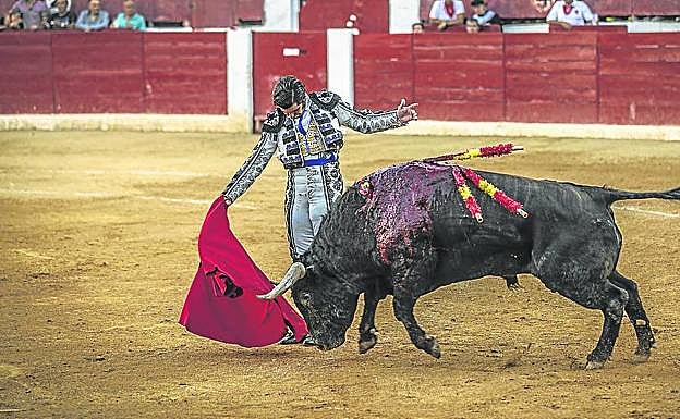 En cuanto le bajó la mano Manzanares a su primero con la muleta se desplomó entre las dos rayas, y ahí se descubrió. Apenas tenía fuerza para mantenerse en pie. Ya lo veníamos presintiendo desde los primeros tercios, en los que comenzó a blandear, pero ya en las distancias cortas acusó más esa falta de poder. Le cogió pronto el aire el alicantino para dar forma a una faena que siempre tuvo la tónica de la media altura y la suavidad. Una buena tanda por el derecho nos metió de nuevo porque el toro tenía codicia y colocaba bien la cara; y, si no le exigía, ni por abajo ni ciñéndoselo a la figura para no obligarlo a doblarse, se mantenía y lo pudo llevar muy cosido a los engaños. Ese fue su mejor pitón y por ahí lo buscó siempre, con un toreo rectilíneo. Lo mimó una barbaridad, y en esa relajación le puso en apuros un par de veces. Con el capote pudo saludarlo bonito a la verónica con un ramillete de media docena y una media que gustó. El viento se cruzó bastante y con una estocada contraria rubricó la faena.