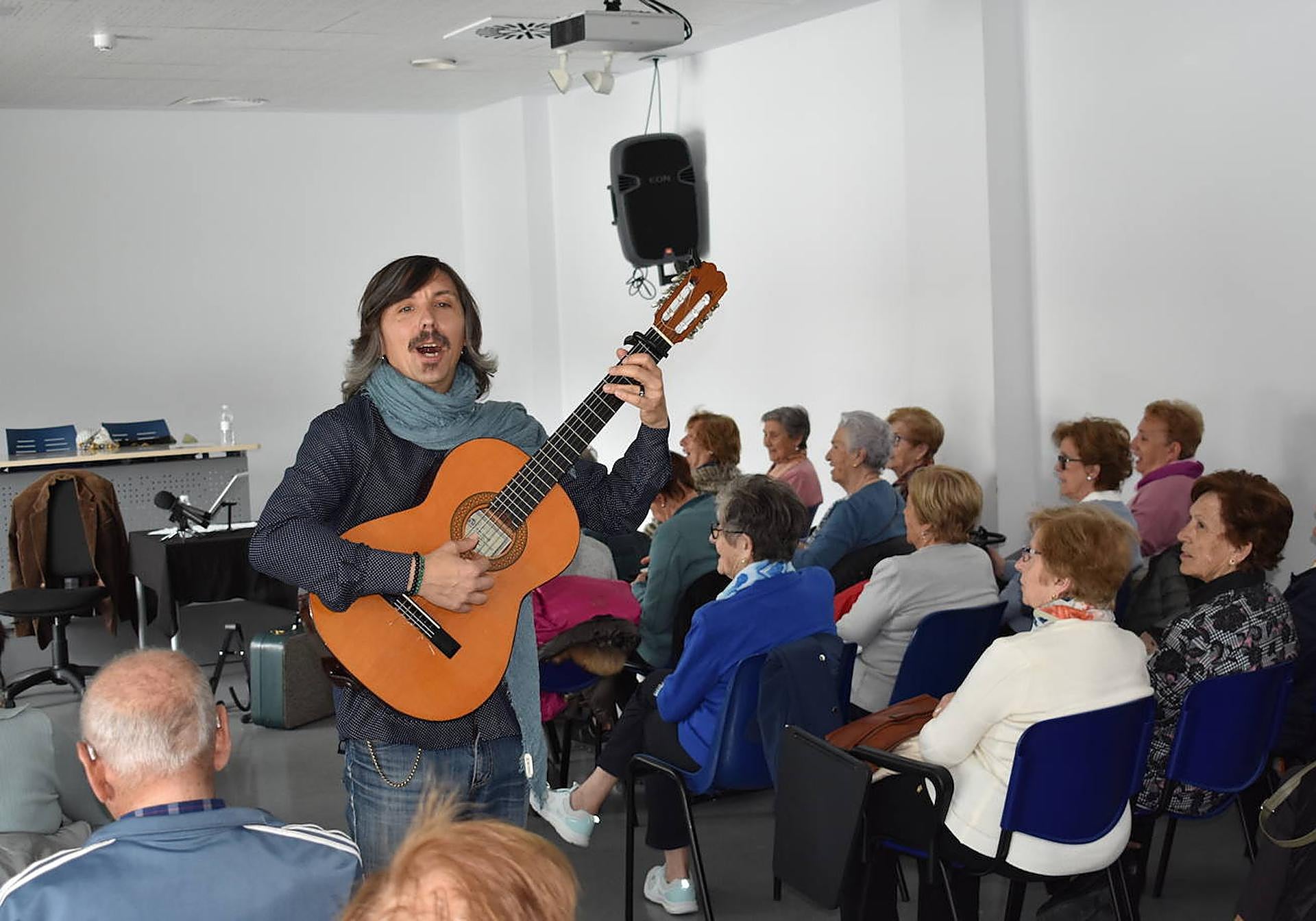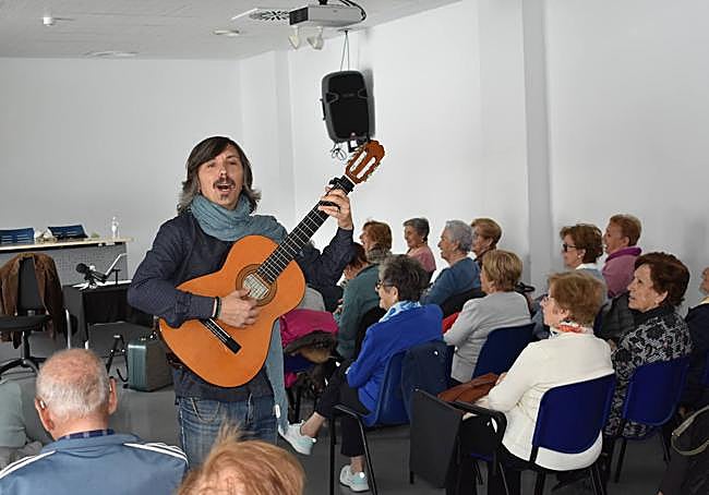 El artista, dinamizador y creador del proyecto de música y salud positiva 'Hier encore', Alejandro Luaces, estuvo ayer por la mañana en el centro joven de Calahorra con más de cuarenta participantes del programa municipal 'Apoyo a personas en situación de vulnerabilidad', dirigido a los mayores con un servicio complementario a la promoción de la autonomía personal y atención de dependientes.