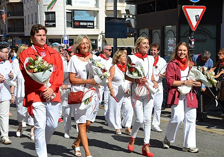 También, la ofrenda de flores sirvió a la peña La Moza para imponer su pañuelo rosa a los niños y niñas de peñistas nacidos en el último año. Los 'peques' y sus familias inmortalizaron este momento con una foto colectiva junto a los santos repletos de flores.