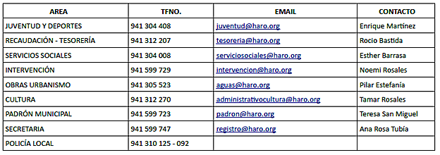 Por otra parte, Todas las funciones del consistorio jarrero seguirán desarrollándose, en su interior, con total normalidad para que no se vea afectada su actividad y se paralice la actividad municipal. El único cambio es que todos los trámites administrativos se ejecutarán desde este momento a través de la sede electrónica: www.haro.org, por teléfono y vía email.