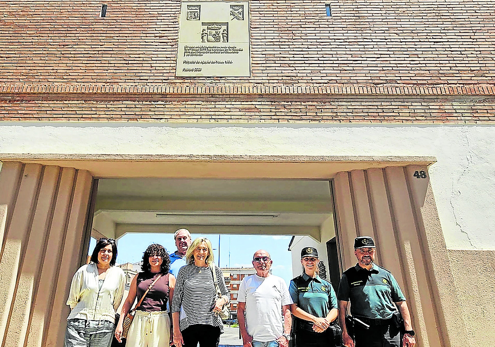 La fachada conservada del antiguo cuartel de la Guardia Civil de Calahorra, en el parque Miguel Ángel Blanco, luce desde ayer una placa con la que se rememora la historia del edificio, diseñado por el arquitecto riojano Agapito del Valle. La pieza –de arenisca– ha sido donada por la empresa Mármoles Calahorra y se ha colocado en el lugar en el que se encontraba el escudo franquista del acuartelamiento, retirado en el año 2009 en cumplimiento de la Ley de la Memoria Histórica. La actual placa muestra el escudo de España, el de la Guardia Civil y el de Calahorra.