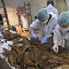 Disgregados y "en muy mal estado", se han encontrado junto con material óseo de varios adultos más en uno de los nichos de la cripta distinto al que contenía la tabla con las iniciales M.C.