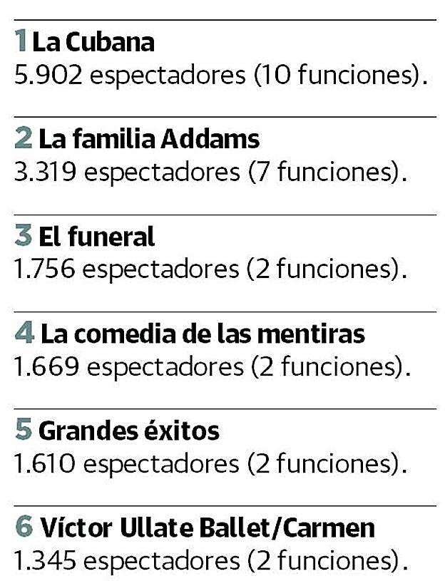 Tras él figura 'La familia Addams' en formato musical, que permaneció en cartel durante las últimas fiestas de San Bernabé y reunió a 3.319 espectadores en sus siete funciones.