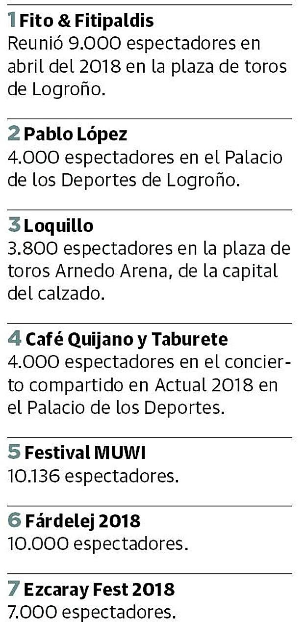 El mismo mérito de estos personajes infantiles tienen los cuatro artistas que a su paso por Logroño lograron llenar el auditorio de Riojafórum, con capacidad para 1.223 personas. Ellos son nuestro músico más internacional, Pablo Sáinz Villegas; Manolo García, en este caso entre 'los primeros de la fila'; Joan Manuel Serrat, entre los grandes de la música de nuestro país; y la bailaora Sara Baras. La lista continúa con nombres como los de Pablo López y Sergio Dalma, y con 'Michael Legend', tributo musical a Michael Jackson.