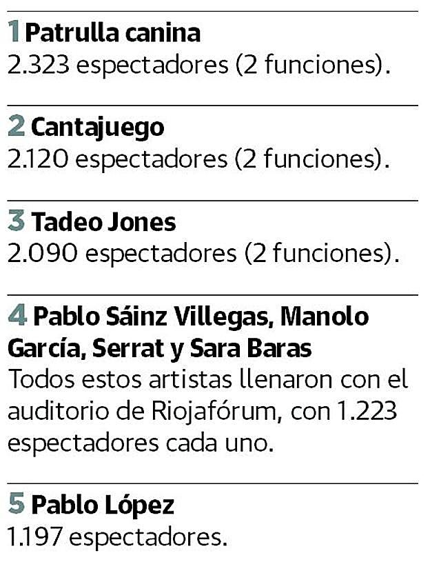 El público infantil es el mejor aliado de la programación cultural en Riojafórum. Los niños, y sus familias, encabezan la relación de espectadores en los montajes más vistos en el auditorio del Palacio de Congresos y Auditorio de La Rioja. Ahí están 'Patrulla canina', con 2.323 espectadores, 'Cantajuego' (2.120) y 'Tadeo Jones' (2.090), todos ellos programados en función doble.