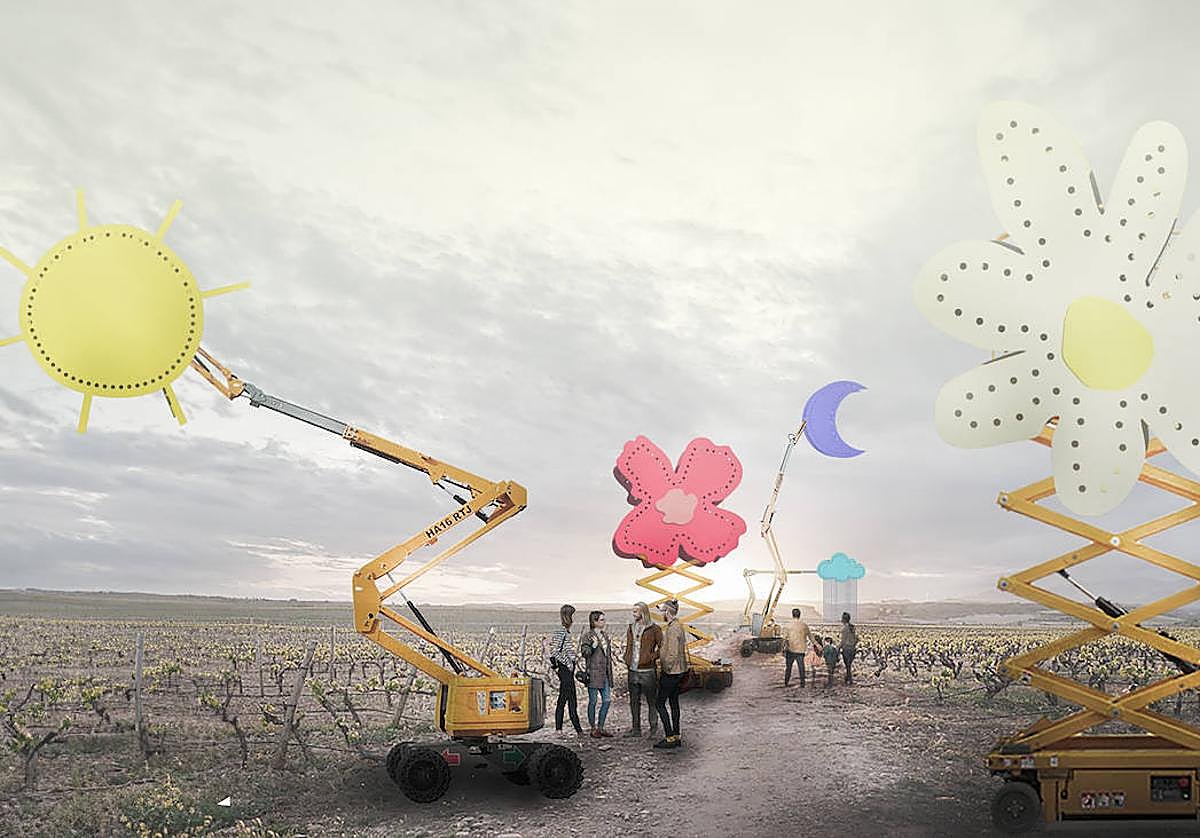 Ya en terrenos de El Cortijo, en Viña Lanciano de Bodegas Lan, la instalación ganadora la firman JI Arquitectos + Blas Antón. Se trata de 'Cuaderno de surcos' y plantea crear un nuevo paisaje sobre los renglones naturales que dibujan los viñedos. Esta reinterpretación del paisaje correrá a cargo de alumnos de Primaria de toda la comunidad, cuyas propuestas (soles, nubes, plantas, aves, arcoiris...) se elevarán sobre el paisaje mediante grúas. Para ello, el 5 de febrero se lanzará un concurso en los centros escolares (con la colaboración del CRIE y Red Planea) del que se seleccionarán entre 10 y 15 dibujos y serán los que finalmente se fabriquen en madera y 'sobrevuelen' los viñedos.