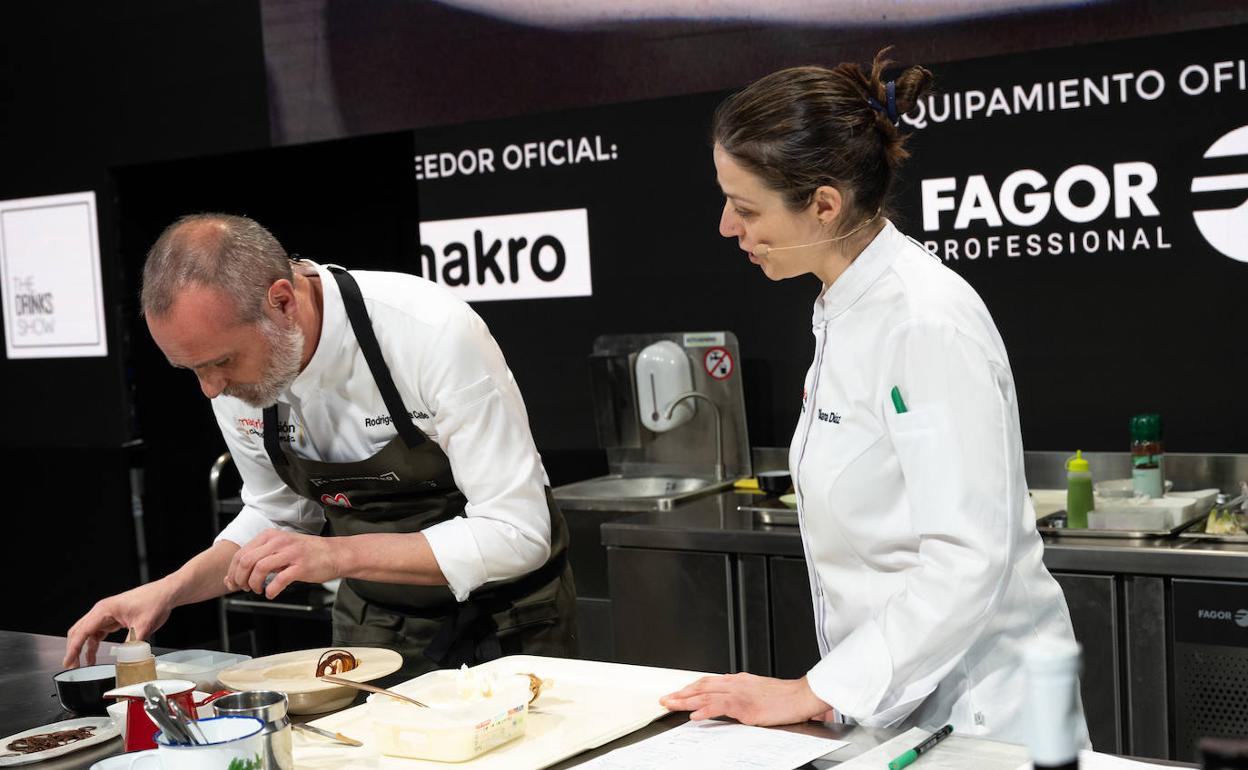 Y entonces apareció Rodrigo de la Calle en su vida cuando trasplantaba El Invernadero desde Aranjuez hasta la madrileña calle Ponzano. Y ahí comenzó una simbiosis creativa de la que el mayor beneficiado ha sido el sabor. Su carta de presentación en su nueva cocina fueron unas navajas vegetales a partir de calçots, cocinados con agua de algas. Ya en el plato se napan con tinta de calamar y se le añade un caldo concentrado de chipirón para terminarlo con una espuma de plancton marino. Aquella primera creación dio paso a muchas más de las que quiso compartir alguna en su presentación en sociedad en el certamen gastronómico.