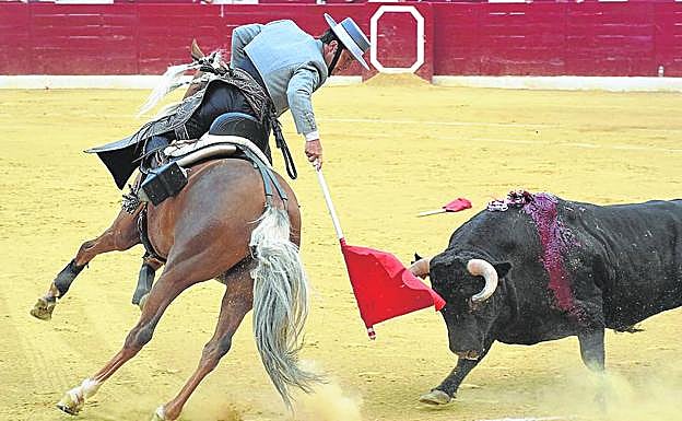 Abrió plaza el rejoneador calagurritano con un toro que buscó en todo momento cobijo en tablas y pasó de todo. Literal. Ni se empleó ni pudo Sergio Domínguez encelarlo para que persiguiera la montura. Se hizo con una oreja a base de llegar a sus paisanos con recursos y pasajes de alta escuela sobre las monturas. La expresión con el caballo hace mucho y ahí brilló el jinete. Lo más destacado de su paso por Calahorra tuvo lugar en el cuarto, al que sí que logró torear con más reunión delante de la cara del toro. La pena fue que se atragantó con el rejón de muerte y se diluyó la faena quedando en una vuelta al ruedo como reconocimiento. No logró marcharse a hombros con Caballero y Esaú. La tarde, sin quererlo, se convirtió en la antesala de la vuelta de Morante 20 años después.