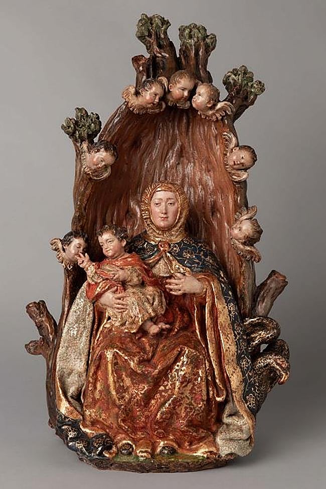 Del barroco es también la deliciosa representación de la Virgen de Valvanera que nos dejó la escultora que, hasta el 9 de marzo, ha recibido homenaje en el museo Nacional de Escultura de Valladolid con la exposición Luisa Roldán. Escultura real. En este caso, además de seguir el modelo vestido y edulcorado propio de esta época naturalista, se añade el simbólico roble en el que fue encontrada, engalanado por una hilera de querubines mirando embelesados a la imagen milagrosa, a modo de guirnalda celestial.