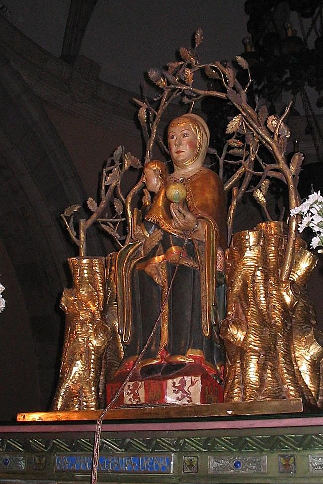 Ha tenido lugar en el museo del Prado una fantástica exposición titulada 'Darse la mano. Escultura y color en el Siglo de Oro', que estuvo abierta hasta el pasado 2 de marzo. En ella podía verse una talla del magnífico retablo de madera policromada que fue el canto de cisne de Damián Forment en Santo Domingo de la Calzada. Pero quiero destacar especialmente sobre el maravilloso conjunto de escultura y pintura expuesto ahí las tres reproducciones del modelo vestido de la virgen de Valvanera, tal y como solía exponerse antiguamente; el mismo modelo que aparece en la imagen de la capilla de los riojanos en la famosa iglesia de San Ginés de Madrid, relacionada con algunos de los grandes artistas del siglo de Oro como Quevedo, Lope de Vega y Tomás Luis de Vitoria. Se trata de una iconografía que actualiza los rasgos primitivos del románico o prerrománico a los gustos más naturalistas del Barroco. Es de esta época cuando surge también la interpretación «realista» que explicaría el giro del cuerpo del niño para dar la espalda, a una supuesta escena sacrílega que ocurría en el tempo. Una de las muchas restauraciones recientes de la imagen incluyó un texto alusivo a este supuesto hecho en el libro que sujeta el niño: «BOLBIO/EL ROSTRO/POR/NO VER/UN SA/CRI/LEGIO».