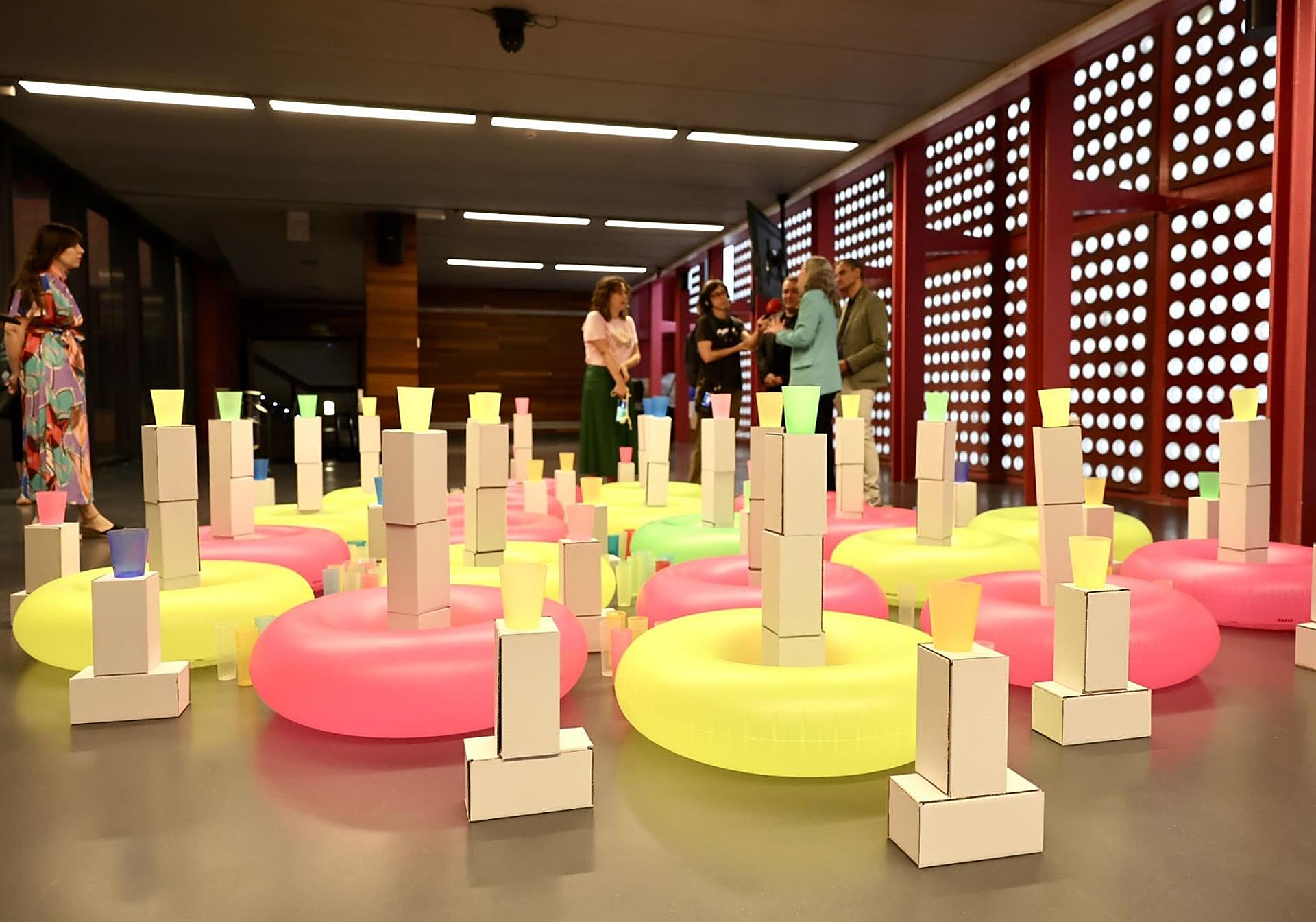 Su propuesta en Logroño se puede disfrutar hasta el 7 de octubre. Y de forma complementaria, en uno de los botelleros del CCR se ofrece una versión más interactiva y participativa de la obra. Allí, familias, colegios y grupos podrán crear su propia instalación manipulando cajas de cartón, flotadores y vasos de plástico.