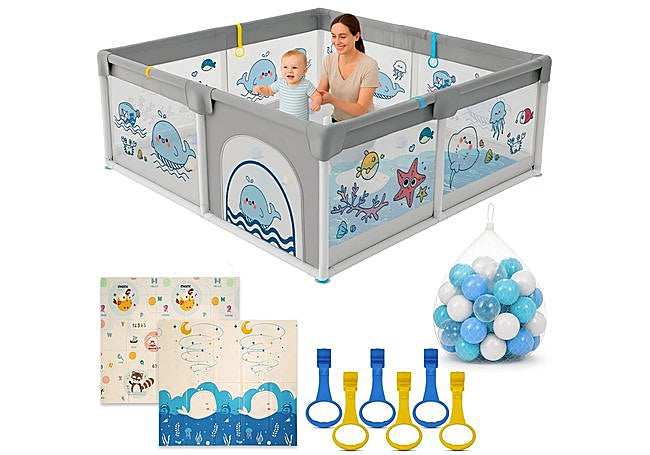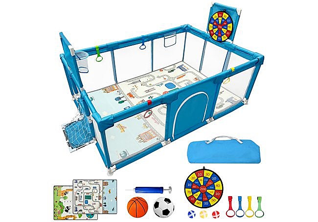 Con estructura amplia y materiales resistentes, el parque infantil BabyJoy de 120x180 cm incorpora accesorios como diana de velcro, canasta y portería integrados en su diseño. Su diseño acolchado incluye materiales que cubren toda la estructura para evitar golpes, y la malla transpirable permite la supervisión visual del interior.
