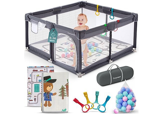 Con estructura robusta y diseño elegante, el parque infantil Cozynest de 120x120 cm incluye alfombra acolchada reversible, 30 bolas de colores y cuatro agarraderas ergonómicas. El acceso lateral con cremallera facilita la entrada, y los materiales resistentes al agua permiten limpieza rápida. Montaje sencillo y bolsa de viaje completan un conjunto seguro y práctico.