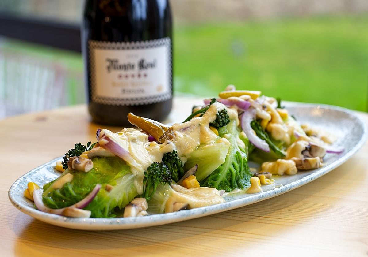 Se monta el plato con una base de cogollos, repartiendo sobre ellos los diferentes ingredientes: maiz dulce, bimi, champiñones y cebolla.