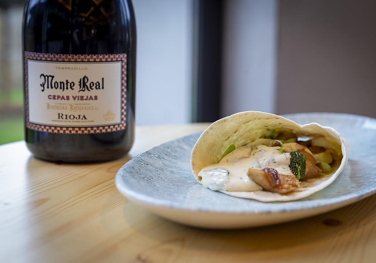 Para 4 personas: Tortitas de trigo, muslo de pollo deshuesado, menta, albahaca, perejil, yogur, mostaza de Dijon, curry, ajopuerro, cebolla morada, ajo, aceite de oliva y aceite de guindilla