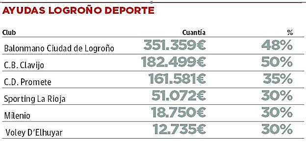 El fútbol está fuera de estas subvenciones porque su realidad «no es comparable» con el resto de disciplinas. Así, son seis los clubes que se reparten las ayudas y es el Ciudad de Logroño el que más recibe, con 351.359 euros, por debajo de los 448.823 que recibió en la campaña anterior al no disputar competición europea. El Clavijo ve reducida la cantidad a percibir en unos 6.000 euros (182.499 frente a los pasados 188.443), mientras que Sporting La Rioja, Promete y Milenio repiten cifra. El Voley D'Elhuyar, que toma el relevo como referencia del desaparecido Voley Logroño recibirá 12.735 euros.