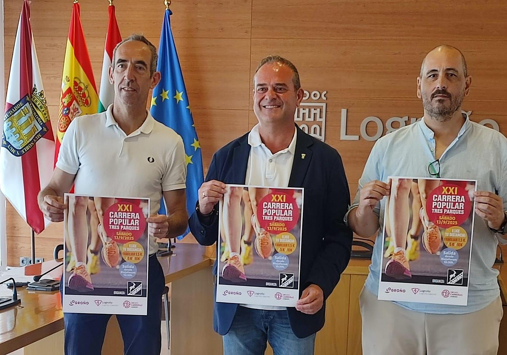 El presidente de Logroño Deporte, Francisco Iglesias, el director de carreras del Club Maratón La Rioja, Jorge Maza, y el directivo Manuel Vergara, del mismo club deportivo que organiza la prueba, han presentado este jueves esta prueba popular.