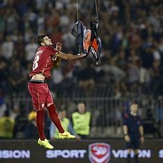 Los futbolistas de ambos equipos se enzarzaron cuando un jugador serbio alcanzó el drone y arrancó la bandera albanesa.