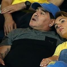 Maradona, con su novia Rocío Oliva, asiste a un partido.