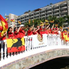 Al ritmo de samba, los componentes de la concentración por la La Roja bailaron, cantaron y hasta hicieron la ola. Hemos querido dar el mayor de los respaldos a nuestro embajador David Silva y a la selección española, que ojalá llegue muy lejos en la Eurocopa de Francia, explica Celia Fonseca, directora de marketing del Grupo Anfi.