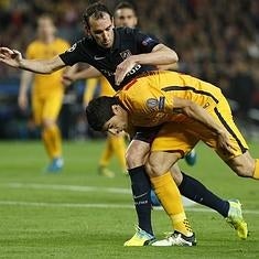 Suárez explicó que la primera parte «no fue un problema de actitud» sino «mérito del Atlético». Marcó por partida doble ante la atenta mirada de su amigo y compañero de selección, Godín, que se lamentaba por haber dejado suelto solo un par de veces a su compatriota. El central volvía al centro de la zaga, después de cuatro semanas lesionado, y se mostró seguro, en un tándem poco habitual con Lucas, que fue un muro durante buena parte del choque. Emparejados con el 9 uruguayo, sujetaron la defensa hasta que llegó el arreón. Godín mandó, fijó la línea y hasta se atrevió a subir al ataque, sobre todo en los saques de esquina y en los golpes francos. El Atlético tenía la defensa en cuadro, pero Godín no faltó a la cita y la superó con nota.