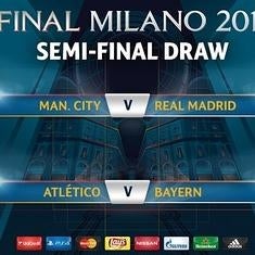 Manchester City-Real Madrid y Atlético-Bayern de Múnich serán las semifinales de la la Liga de Campeones. El Real Madrid se enfrentará al City en Mánchester el martes 26 de abril y recibirá en el Bernabéu al equipo inglés el miércoles 4 de mayo, mientras que el Atlético disputará la ida en el Calderón contra los alemanes el 27 de abril, con el la vuelta en el Allianz Arena el 3 de mayo.