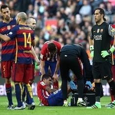Godín, expulsado por doble amarilla en feudo culé, también pasó pruebas en la clínica FREMAP de Majadahonda, acompañado del doctor José María Villalón. Sufre un esguince de grado uno en el ligamento de la rodilla izquierda y permanecerá en el dique seco entre dos y tres semanas. Su ausencia ante el equipo eibarrés de Mendilibar se suma a la de Juanfran, que vio la quinta amarilla, y Filipe, expulsado por su durísima entrada a Leo Messi. Simeone tendrá que alinear al montenegrino Savic, al veterano Jesús Gámez y, si se recupera de sus problemas en la espalda, al joven Lucas Hernández de lateral izquierdo. Si el internacional francés no está bien, se piensa en el belga Yannick Carrasco como carrilero.