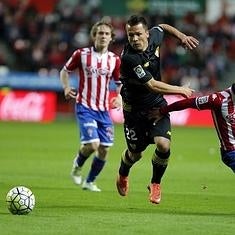 En el minuto 22, un robo en el centro del campo propició una contra con mayoría de efectivos gijoneses que culminó con un pase de Halilovic sobre Jony, que centró sobre la llegada de Isma López y Sanabria, pero Krychowiak tocó el balón y lo introdujo en la portería.