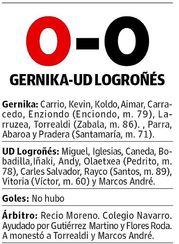 Si no puedes ganar, no pierdas. Una máxima del fútbol, aunque los tres puntos con los que se premia la victoria frente al único que ... otorga el empate invita a arriesgar. Eso debe pensar el Gernika, que a pesar de jugarse la permanencia ofertó un partido cerrado y trabado con el único reto de no encajar un gol de la UD Logroñés que, desde luego, no necesitaba tanto la victoria. Queda a tres puntos del Mirandés y aventaja en cinco al Barakaldo. No es malo por tanto el punto en una visión global; si la mirada queda entre los montes que rodean Guernica, el marcador es más pobre.