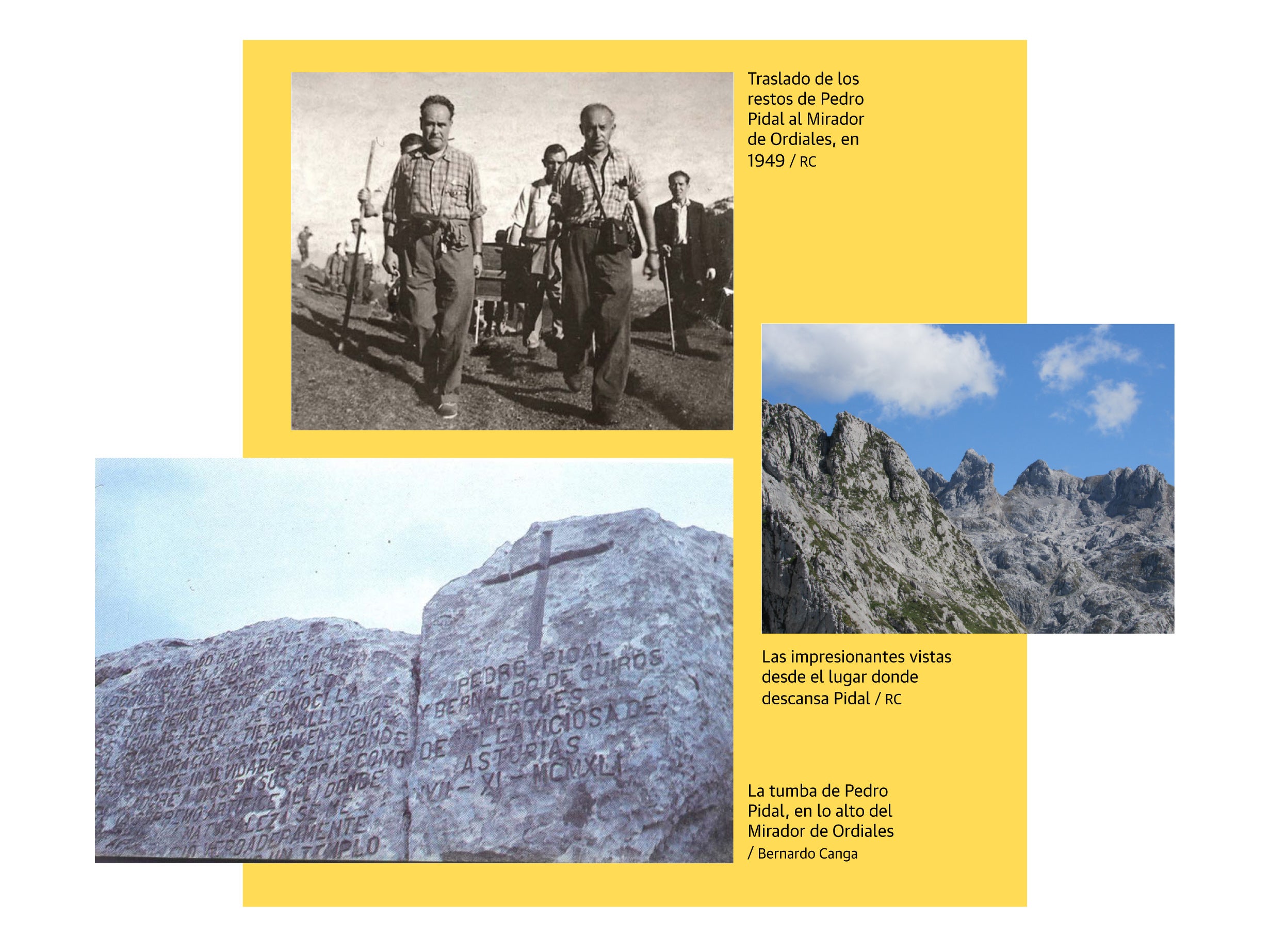 En el Mirador de Ordiales, a 1.750 metros de altura, en un balcón natural que descubre una de las estampas más espectaculares de los Picos de Europa, reposan los restos de Pedro Pidal y Bernaldo de Quirós (Gijón, 1869-1941), adonde fueron trasladados a hombros por montañeros y amigos siguiendo sus últimos deseos, tal y como reza el epitafio de su tumba, junto a una gran cruz labrada sobre una imponente piedra: «Enamorado del Parque Nacional de la Montaña de Covadonga, en él desearíamos vivir, morir y reposar eternamente, pero, esto último, en Ordiales, en el reino encantado de los rebecos y las águilas, allí donde conocí la felicidad de los cielos y de la tierra, allí donde pasé horas de admiración, emoción, ensueño y transporte inolvidables, allí donde adoré a Dios en sus obras como Supremo Artífice, allí donde la Naturaleza se me apareció verdaderamente como un templo».