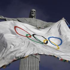 La bandera olímpica ondea junto a la estatua de Cristo Redentor.
