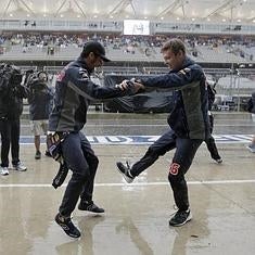 Daniel Ricciardo (i) y Daniil Kvyat (d) bailan bajo la lluvia de Austin.