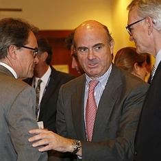 El ministro de Economía, Luis de Guindos (c), conversa con el presidente de la Generalitat, Artur Mas (i), y el presidente del Círculo Economía, Anton Costas (d).