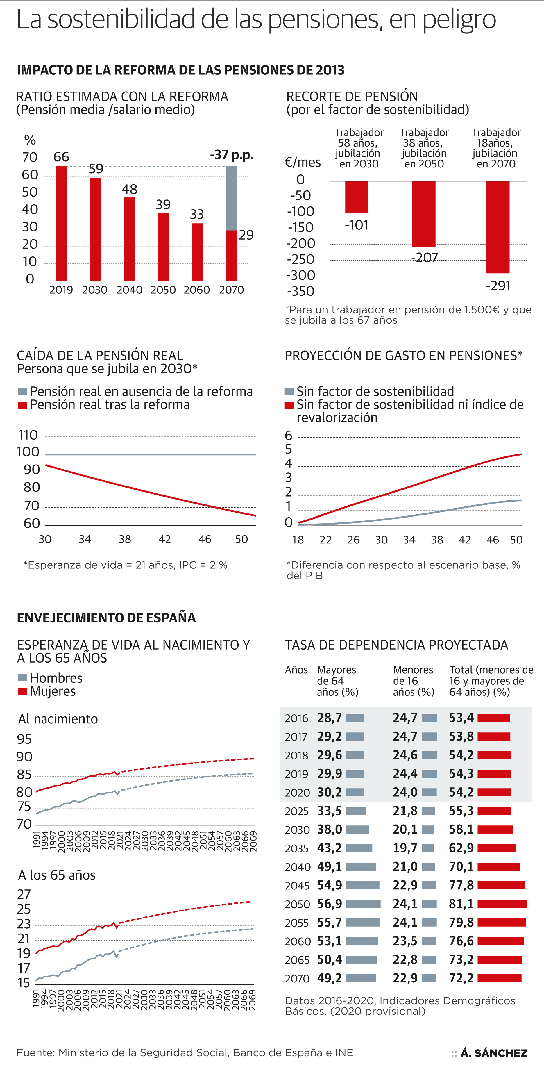Para contener este gasto, la reforma de 2013 de Mariano Rajoy creó un factor de sostenibilidad que nunca llegó a aplicarse pero que reducía las nóminas de los nuevos pensionistas en función de la esperanza de vida. Hasta el punto de que, de no haberse derogado, hubiera recortado la pensión en más de 100 euros de media en 2030 y la merma rozaría los 300 euros en 2070, según las estimaciones que esta pasada semana ofreció el ministro de Seguridad Social, José Luis Escrivá.