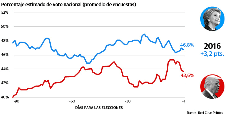 A pesar de esto, Biden llega con mejores números que Hillary Clinton hace cuatro años: el ex vicepresidente supera en más de tres puntos el dato de la exsecretaria de Estado el día de las elecciones.