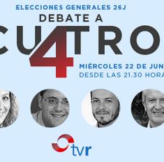 TVR emite esta noche el debate 'a cuatro' entre candidatos de PP, PSOE, Unidos Podemos y Ciudadanos. Son las principales formaciones políticas entre las once que concurren en La Rioja a estas elecciones generales y que aglutinaron el 93% de los votos de los riojanos en la última cita con las urnas, el 20 de diciembre.