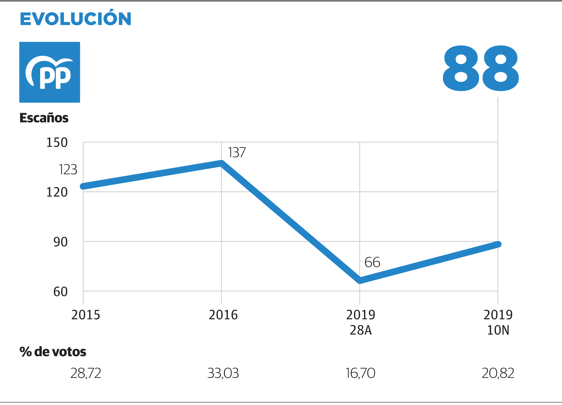 De momento, sin embargo, en el PP hay unanimidad en colocar la pelota del desbloqueo en el tejado del PSOE y esperar. La posición oficial la marcará, en todo caso, este martes Pablo Casado en la sede nacional del partido. Ha convocado al comité ejecutivo para analizar el escenario poselectoral y los resultados del 10 de noviembre. La subida de 22 escaños respecto al 28-A, que deja a los populares en 88 diputados, se ha celebrado en las filas conservadoras con cierta amargura por el ascenso meteórico de Vox. Si bien se dan por satisfechos con haber recuperado el centro político, donde Ciudadanos naufragó, les inquieta el auge de Abascal en la medida en la que no pueda ser revertido en las próximas elecciones y les deje sin espacio para crecer.