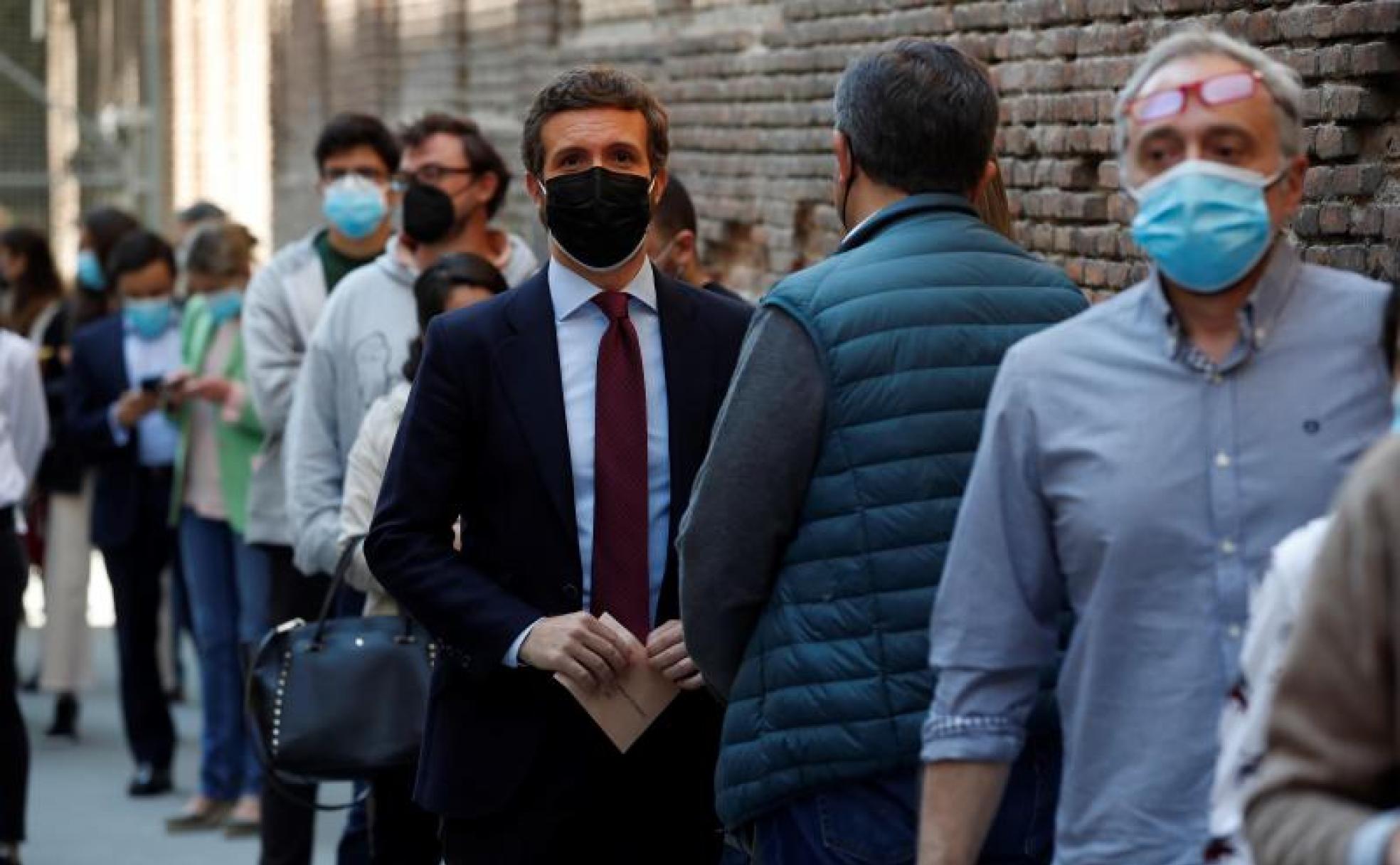 El presidente del PP, Pablo Casado, hace cola a las puertas del Colegio Nuestra Señora del Pilar de Madrid. Efe / Vídeo: Virginia Carrasco