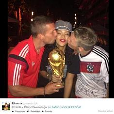 La cantante subió fotos con casi todos los jugadores de Alemania pero entre todas destaca en la que se hace un 'trío de besos' con Podolski y Schweinsteiger. También se hizo una foto con Mario Götze, el autor del único gol de la final, en la que Rihanna aparece abrazándole y lanzando un beso a la cámara.