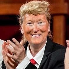 Disfrazada del magnate, con peluca rubia, enorme barriga y la piel pintada de naranja, la protagonista de cintas como "Los puentes Madison" imitó la voz, la retórica y los gestos del candidato republicano en la gala.