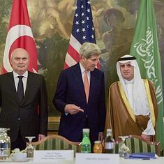 John Kerry (c) junto a los ministros de Exteriores de Turquía y Arabia Saudí.