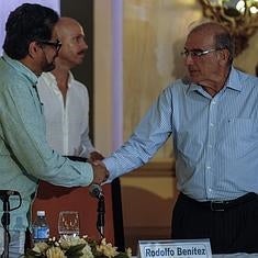 El comandante de las FARC, Iván Márquez (i), y el jefe del equipo negociador del gobierno de Colombia, Humberto de la Calle.