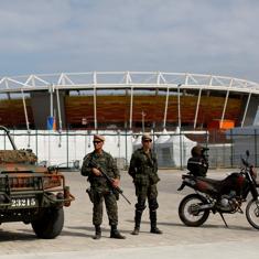 Soldados, frente a uno de los estadios de los Juegos Olímpicos.