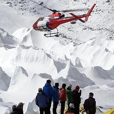 Un helicóptero de rescate sobrevuela el campamento base del Everest.
