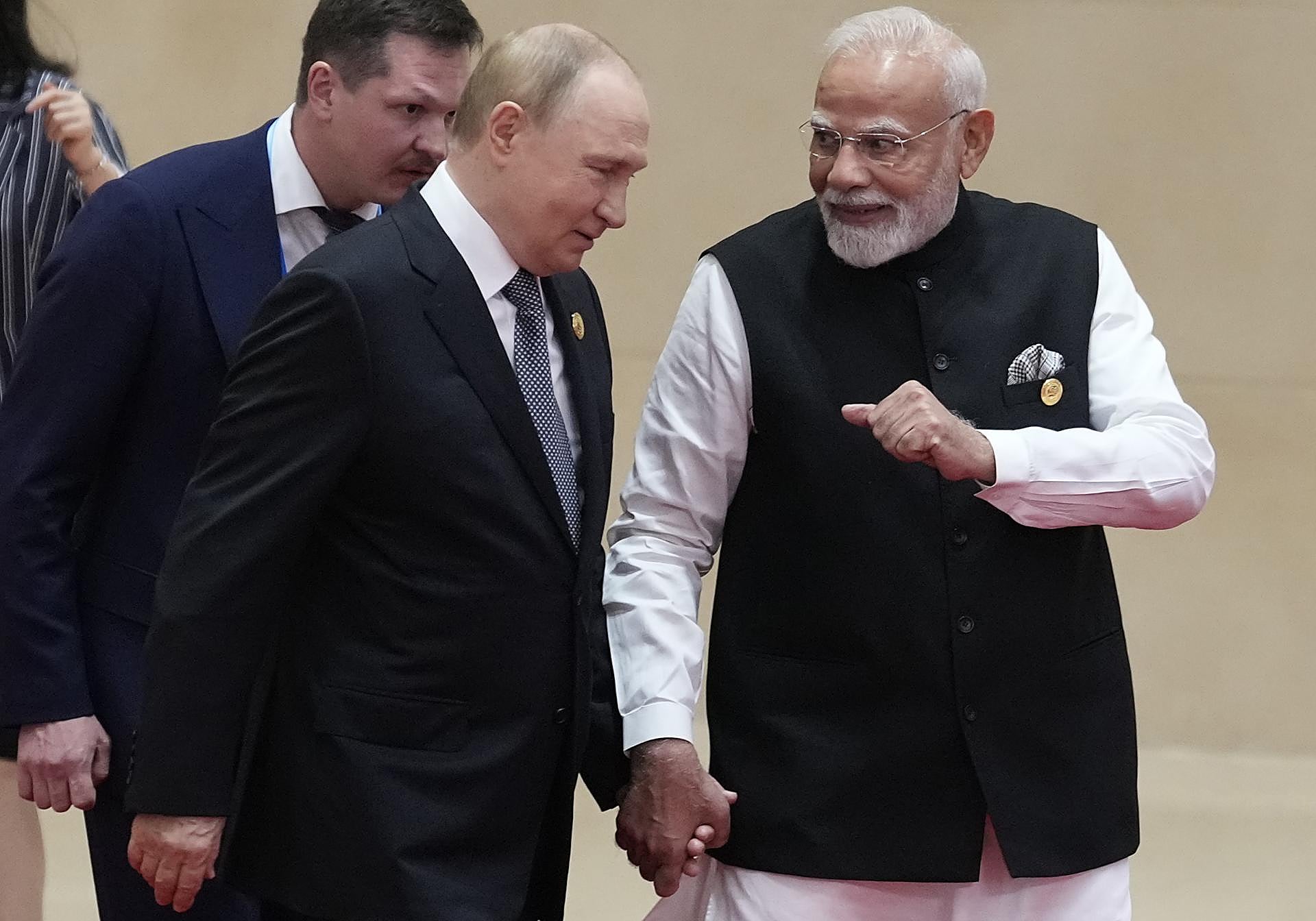 Vladímir Putin, Narendra Modi y Xi Jinping conversan durante la cumbre. AFP